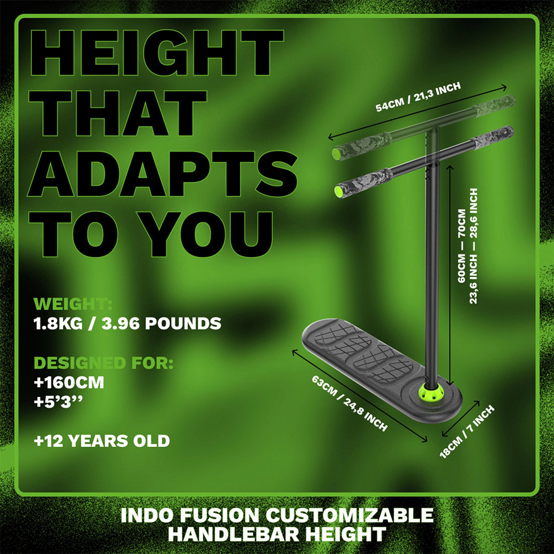 The INDO Fusion comes equipped with an advanced ball head bearing system, allowing for incredibly smooth turns and quick responses to tricks. This ensures full control and smooth landings—just like the pros. The adjustable handlebars let you customize the Fusion to fit your style, whereas the soft and grippy TPU handgrips ensure a firm hold, even when performing more challenging tricks.