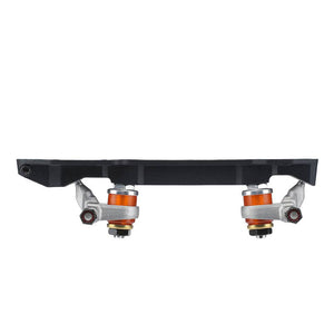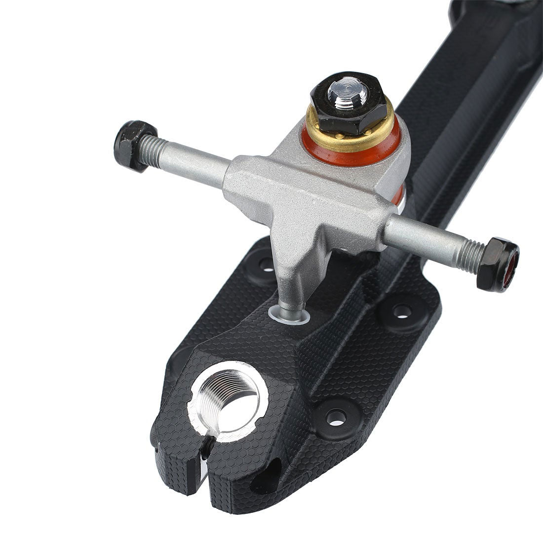 Reinforced with fiberglass that improves its tensile strength and durability, the Fuse also has an integrated aluminum toe stop housing complete with a 5mm hex bolt for toe stop security. Aluminum fixed-pivot trucks rest on 10° kingpins, creating an action that is stable, steady, and offers superior pushing and acceleration. Precision click-adjustment of the kingpin nut allows easy customization of cushion pressure.