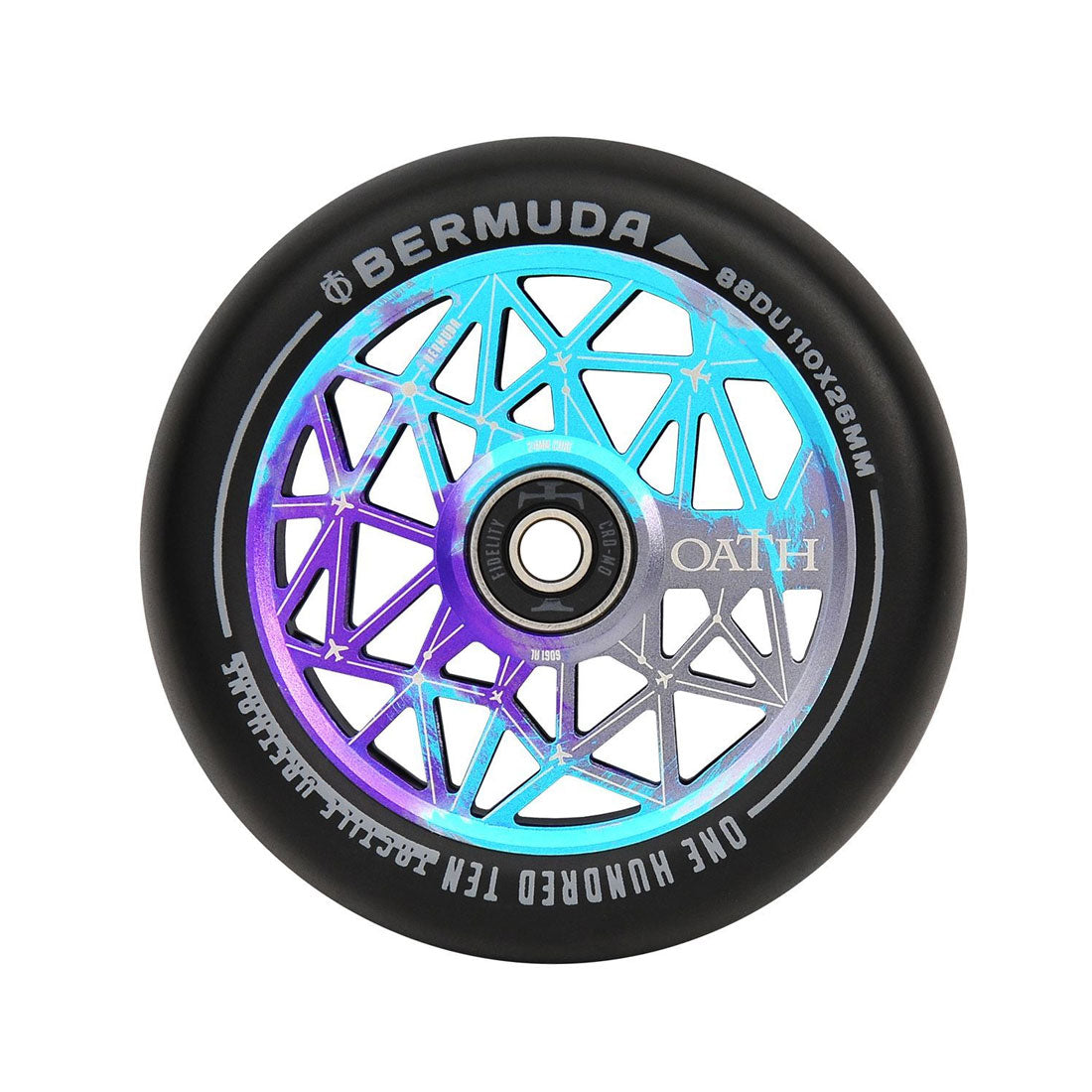 Triad has dropped the Oath Bermuda, and boy is it beautiful. The profound detail in the geometric shapes coming in and out at you everywhere is mesmerizing. With a tapered fatter 26mm and low profile 110mm tire, this truly is the perfect scooter wheel that is compatible with standard size forks.